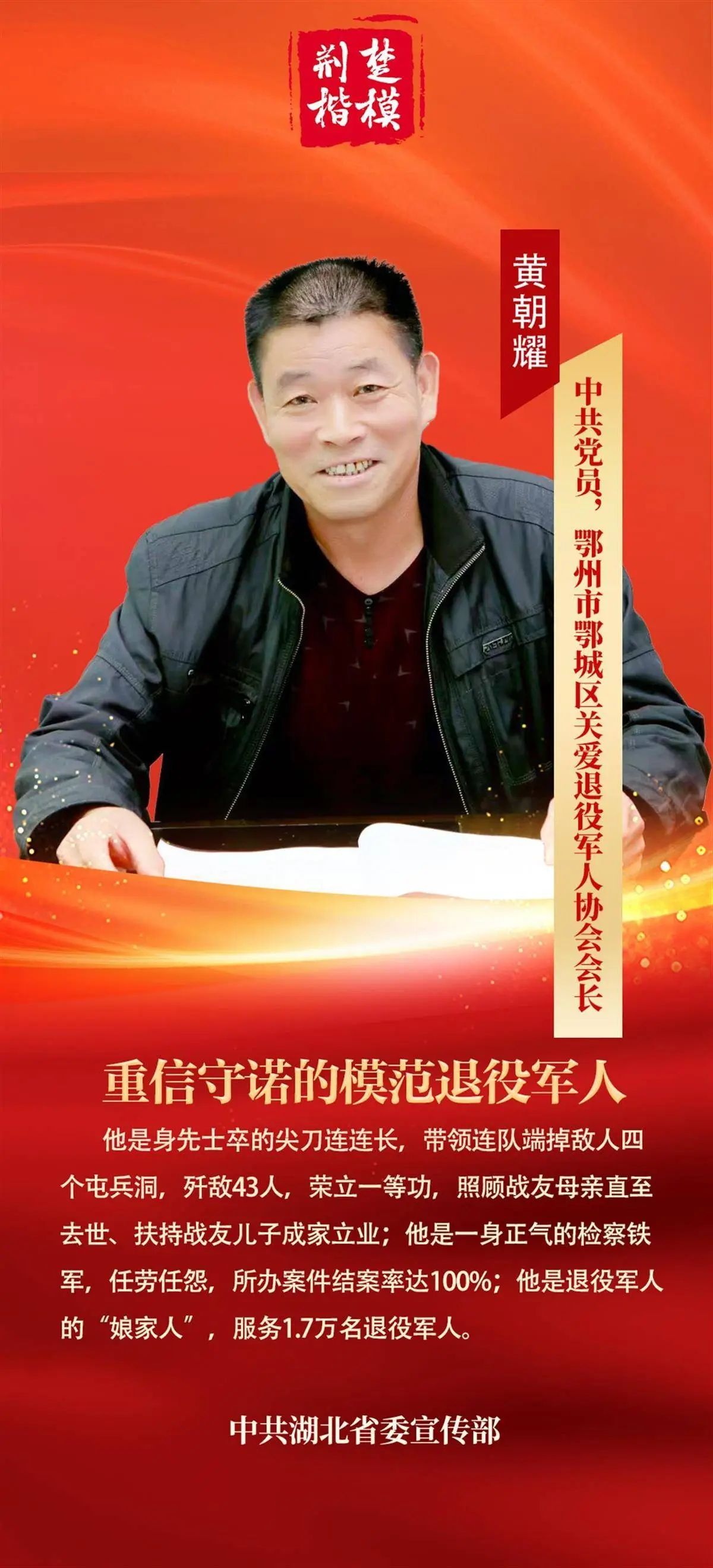 “荊楚楷模”關(guān)于黃朝耀的頒獎詞為:他是身先士卒的尖刀連連長,帶領(lǐng)連隊端掉敵人四個屯兵洞,殲敵43人,榮立一等功,照顧戰(zhàn)友母親直至去世、扶持戰(zhàn)友兒子成家立業(yè);他是一身正氣的檢察鐵軍,任勞任怨,所辦案件結(jié)案率達(dá)100%;他是退役軍人的“娘家人”,服務(wù)1.7萬名退役軍人。2024年,他榮獲“全國模范退役軍人”榮譽稱號。