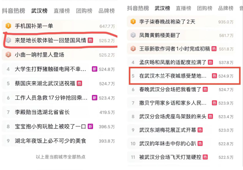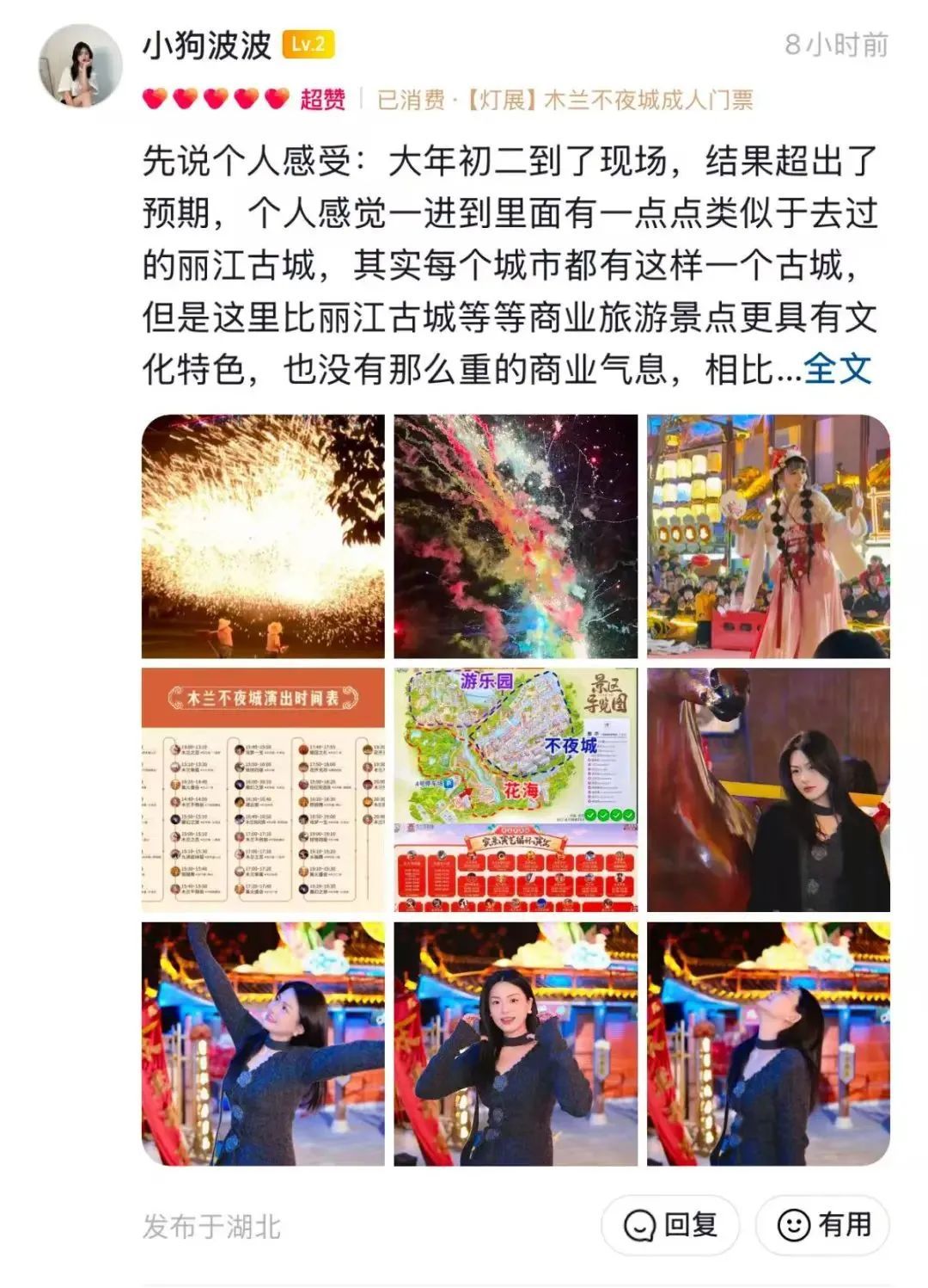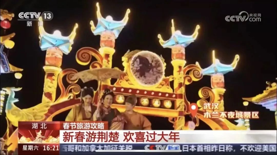 2月1日,央視新聞直播間欄目以《新春游荊楚,歡喜過大年》為題,聚焦湖北武漢鄉(xiāng)村游。解說詞說道:“武漢木蘭不夜城景區(qū),是以沉浸式夜游和木蘭文化實(shí)景演出為特色的旅游景區(qū)。春節(jié)假期,除了賞燈會(huì)、看民俗,木蘭不夜城全新打造的沉浸式劇場(chǎng)《楚地長(zhǎng)歌》,為游客帶來更多元化的沉浸式打卡體驗(yàn)”。