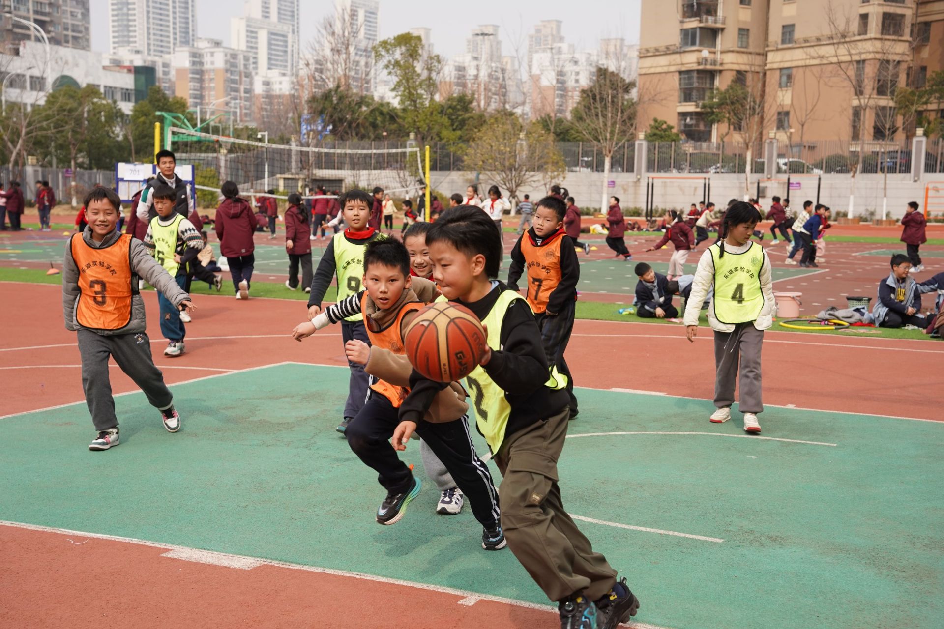 運(yùn)球、突破、投籃……一場激烈的籃球比賽正在東湖實(shí)驗(yàn)學(xué)校操場上進(jìn)行,小球員們身著鮮艷的隊(duì)服,臉上洋溢著稚嫩卻堅(jiān)定的神情。