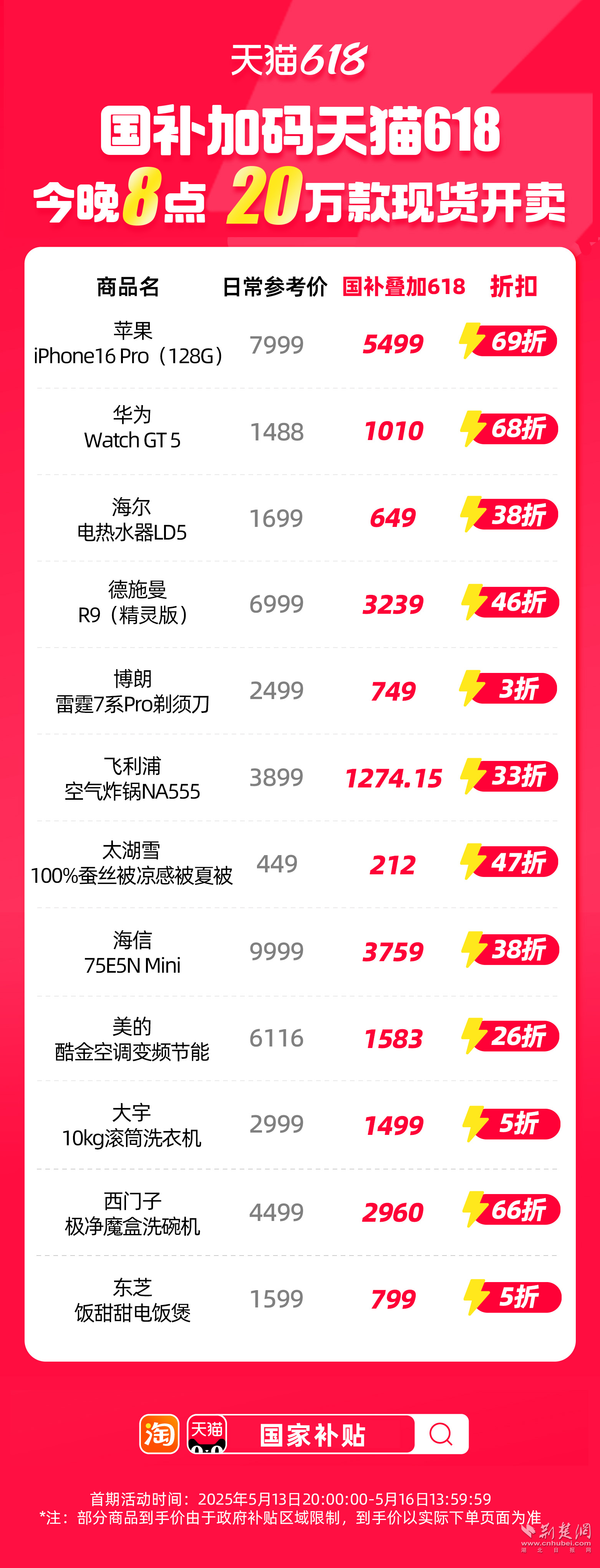 蘋果直降2000元,iPhone16 Pro首次進(jìn)入國補(bǔ),到手價(jià)5499元。大宇10公斤滾筒洗衣機(jī),國補(bǔ)疊加618優(yōu)惠,打5折,到手價(jià)1499元;美的節(jié)能空調(diào),打35折,到手價(jià)1583元;75寸Mini LED海信電視,打38折,補(bǔ)貼后到手價(jià)3759元;西門子極凈魔盒洗碗機(jī),打66折,到手價(jià)2960元;東芝飯?zhí)鹛痣婏堨?,?折,到手價(jià)799元。