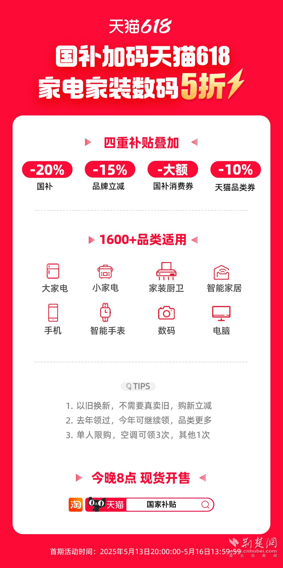 荊楚網(wǎng)(湖北日報(bào)網(wǎng))訊(通訊員 朱飛)天貓618重磅加碼國補(bǔ),家電、家裝、家居、3C數(shù)碼等品類將低至5折,今晚8點(diǎn),現(xiàn)貨開賣。