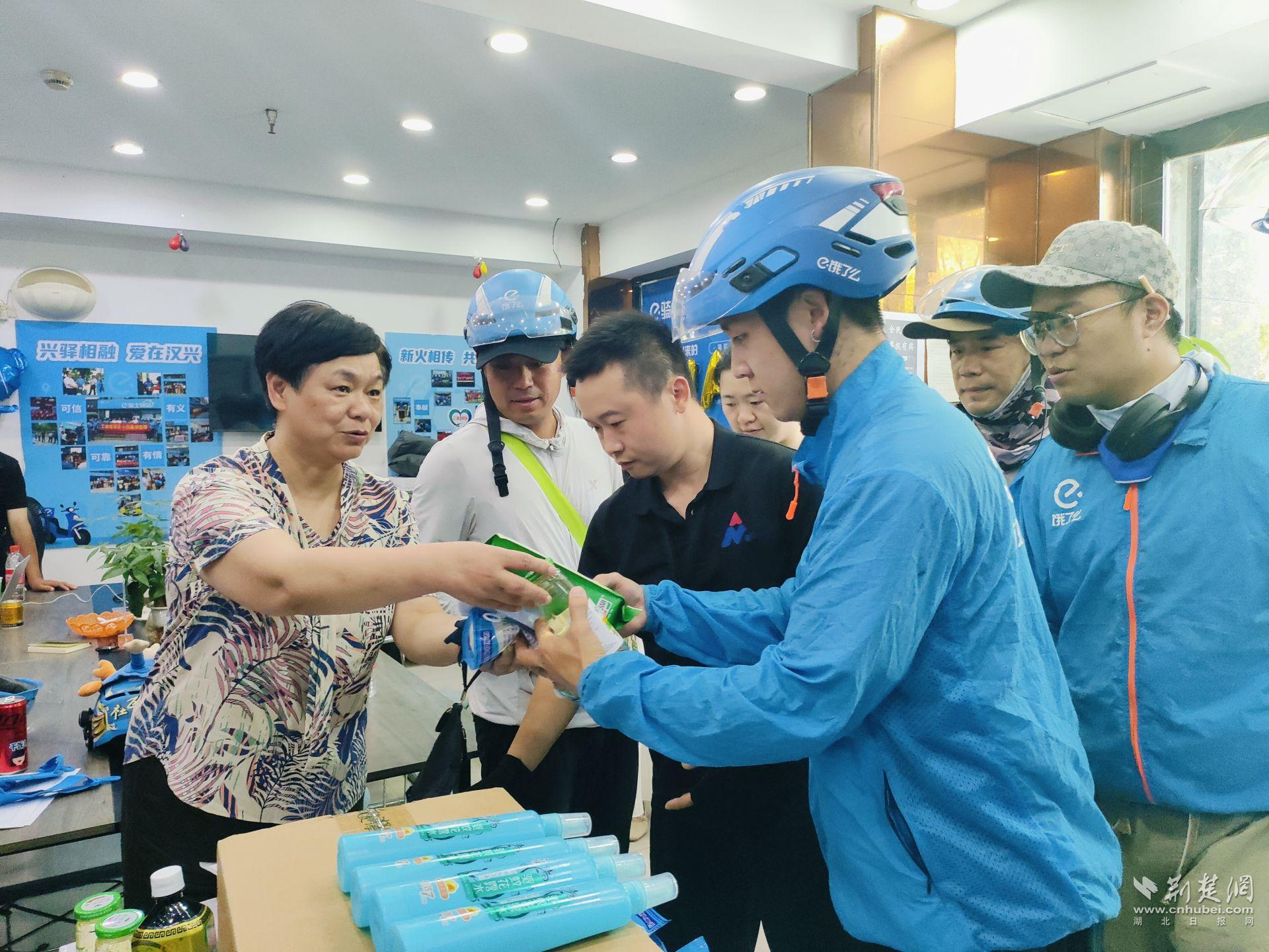 就在前一天,江漢區(qū)總工會(huì)來到紅旗渠路驛站,為高溫中堅(jiān)守崗位的外賣騎手們送去綠豆、花露水、酸梅膏、冰袖等共計(jì)50份防暑物資,將清涼和關(guān)懷一并送到一線勞動(dòng)者手中。