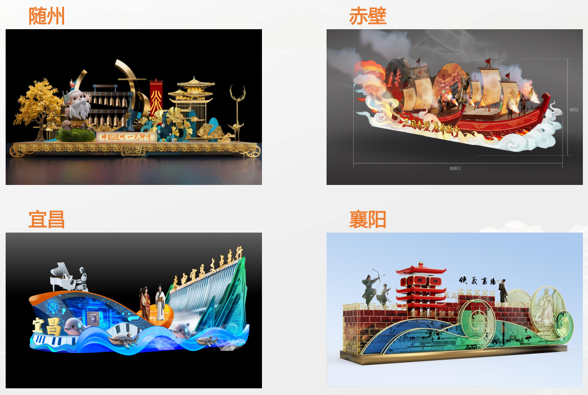 3、“楚風(fēng)漢韻”花車:《鳳舞楚天》、《問道武當(dāng)》、《神農(nóng)架梆鼓》、知音號、《西蘭卡普》;