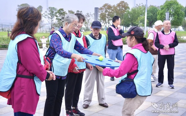 活動現(xiàn)場設置了三個互動游戲區(qū)域,“不倒森林”游戲中,老人們圍成一圈,默契配合轉動長桿;“四平八穩(wěn)”環(huán)節(jié),大家小心翼翼地操控游戲道具,努力保持小球平衡;“同舟共濟”時,三人一組相擁站在墊子上協(xié)同挪動。這些趣味拓展活動不僅鍛煉了老人們的協(xié)調能力,更在歡聲笑語中增進了鄰里情誼。