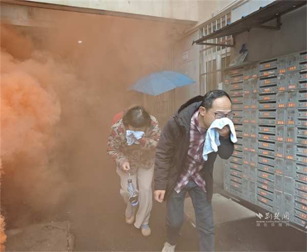 隨后,6棟居民樓模擬火災(zāi)疏散演練啟動?!盁熿F彈點燃!滅火組壓制初期火源,疏散組組織撤離!”指令下達后,滅火組迅速攜帶器材沖進樓道撲救模擬起火點;疏散組手持熒光指揮棒,在樓層樓梯口、轉(zhuǎn)角處布控,引導(dǎo)居民彎腰捂鼻、有序撤離。