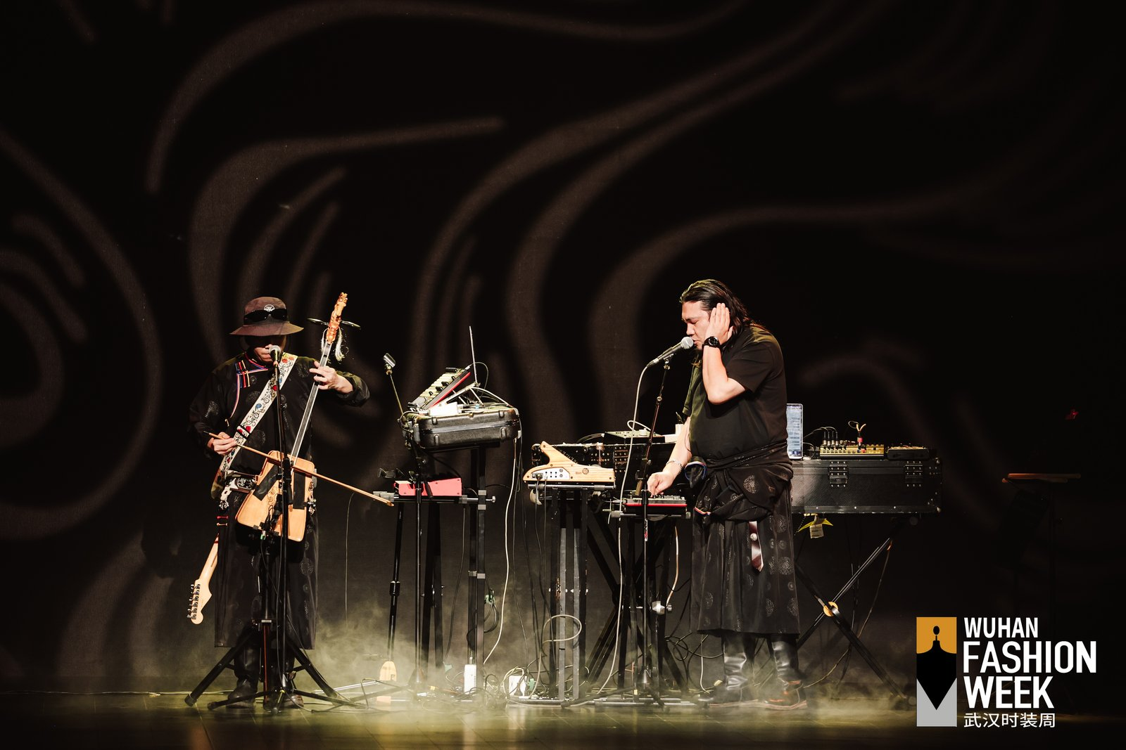 陳宇攜手Taiga樂(lè)隊(duì),把錫林郭勒草原的晨霧、馬頭琴與電子節(jié)拍轉(zhuǎn)化成可行走的時(shí)裝音景??沙掷m(xù)植物素皮、流蘇與繩結(jié)形成呼應(yīng),讓游牧精神在當(dāng)代廓形中保持自由。