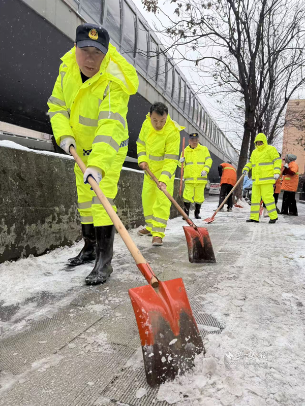 1月19日深夜至20日凌晨,隨著雪勢(shì)加大,街道應(yīng)急搶險(xiǎn)隊(duì)伍迅速化身“風(fēng)雪夜行人”,頂著嚴(yán)寒奔赴一線。他們采取機(jī)械作業(yè)與人工作業(yè)相結(jié)合的方式,對(duì)轄區(qū)主次干道、橋梁、陡坡、十字路口等重點(diǎn)路段和易結(jié)冰區(qū)域,進(jìn)行循環(huán)撒布融雪鹽和清掃作業(yè),最大限度預(yù)防道路結(jié)冰。寒夜中,隊(duì)員們衣衫被雪花浸濕,臉頰被寒風(fēng)凍紅,但無(wú)人退縮,持續(xù)堅(jiān)守。天色微明,雪勢(shì)稍歇,隊(duì)伍立即轉(zhuǎn)戰(zhàn),對(duì)背街小巷、人行道、天橋等區(qū)域的殘留積雪進(jìn)行清理,并在坡道、臺(tái)階等易滑處鋪設(shè)防滑草墊、設(shè)置警示標(biāo)識(shí),全力保障早高峰出行安全順暢。