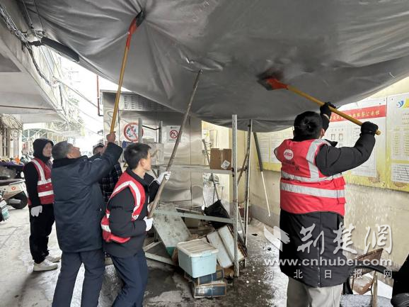 除雪過程中,工作人員發(fā)現(xiàn)一處老舊小區(qū)宿舍門前遮雨棚因積雪堆積嚴重變形,存在垮塌隱患。大家立即分工協(xié)作,有的手持長桿清理棚頂積雪,有的在下方拉起警戒線、疏導居民通行,及時消除了高空墜物風險,為居民撐起一把“安全傘”。