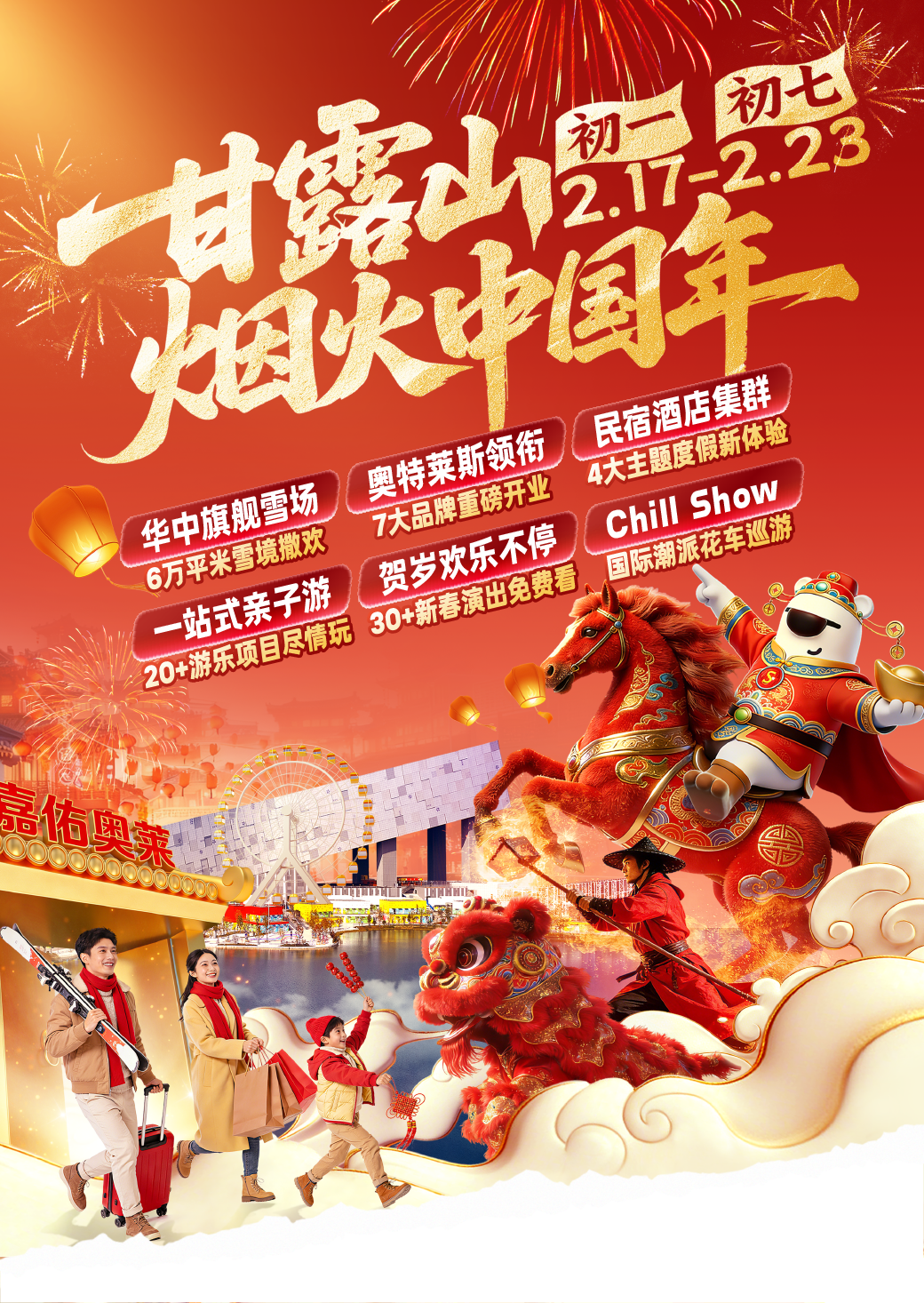 甘露山文創(chuàng)城煙火中國年作為重磅項(xiàng)目,連續(xù)7天呈現(xiàn)水上非遺火龍鋼花、瀑布煙花、光影秀、財(cái)神巡游等精彩內(nèi)容,打造集視覺震撼、文化體驗(yàn)、休閑購物于一體的綜合性節(jié)日度假目的地。