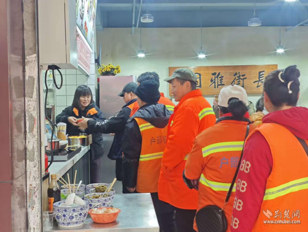 為環(huán)衛(wèi)工人送免費熱干面。 通訊員供圖
