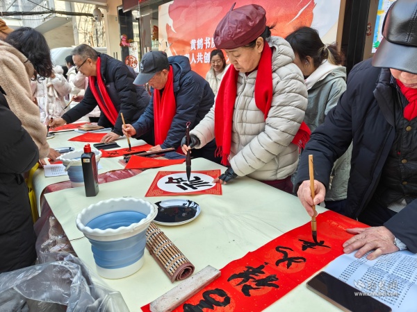 靜態(tài)的閱讀空間里藏著動態(tài)的文化活力。每周固定開展的書法研習(xí)、讀書分享活動中,總能看到老少讀者沉浸其中的身影。青少年圍坐桌前臨摹字帖,老年讀者在窗邊沉浸品讀,年輕父母攜娃共讀繪本,不同年齡層在墨香與書聲中和諧交流。春節(jié)期間,書房特邀首義書畫協(xié)會的老師現(xiàn)場揮毫,紅紙鋪展間,一副副滿載祝福的春聯(lián)、一張張寓意吉祥的福字被送到居民手中,讓文化關(guān)懷伴隨墨香走進(jìn)千家萬戶?!笆謱懙拇郝?lián)更有溫度,墨香里都是社區(qū)的關(guān)懷。”居民李阿姨接過春聯(lián)時笑著說,她的話也道出了居民共同的心聲。