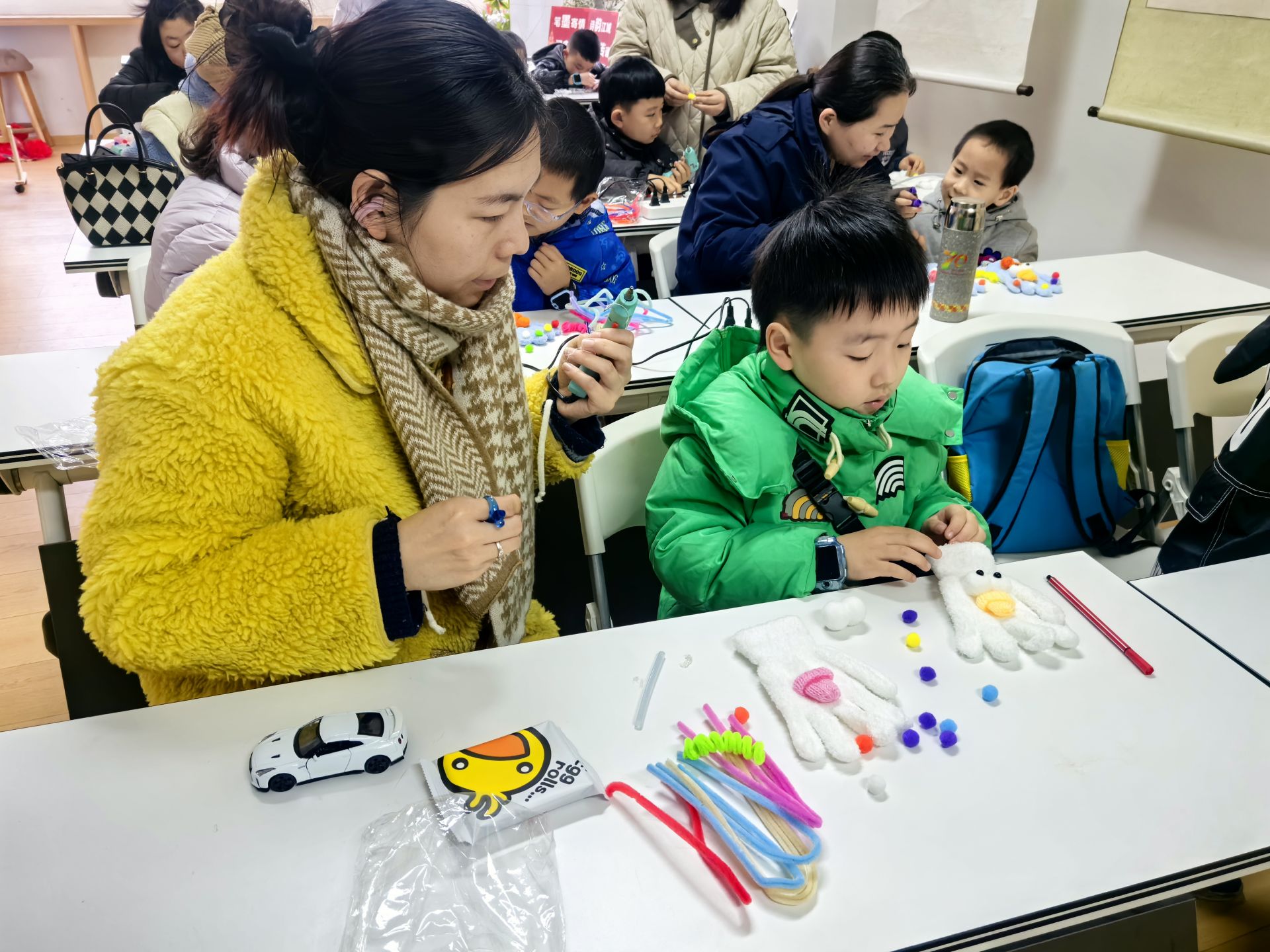 活動開始,指導(dǎo)老師先為大家簡要講解了傳統(tǒng)布藝中“拼接點(diǎn)綴、化繁為簡”的制作理念。隨后,通過一步步的示范,引導(dǎo)大家將萌趣材料與傳統(tǒng)技法相結(jié)合。在創(chuàng)作環(huán)節(jié),家長們耐心協(xié)助孩子固定面料、梳理細(xì)節(jié);孩子們則充分發(fā)揮天馬行空的想象力,用扭扭棒彎折出立體的耳朵與花紋輪廓,將彩色毛球粘貼成點(diǎn)綴裝飾,再為手套貼上靈動的小眼睛。
