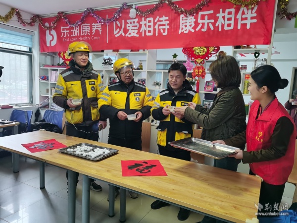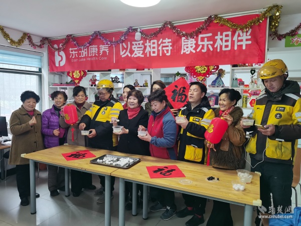 活動當天,讀書社區(qū)養(yǎng)老服務中心內歡聲笑語、暖意融融。來自不同群體的志愿者們分工協(xié)作、配合默契,社區(qū)退役軍人服務隊的隊員揉面、拌餡有條不紊;武漢客運段的志愿者們手法嫻熟,搓圓捏餡一氣呵成;居民志愿者們則在一旁燒水備碗、忙前忙后。大家圍坐在桌前,一邊包著湯圓,一邊拉著家常,在裊裊升起的熱氣中,心與心貼得更近了。