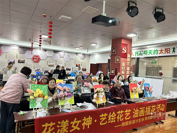 活動(dòng)現(xiàn)場(chǎng),長桌上整齊擺放著畫布、油彩、花材等材料。啟晨便民服務(wù)中心專業(yè)老師細(xì)致講解油畫色彩搭配、筆觸運(yùn)用技巧,手把手指導(dǎo)花材修剪、造型搭配要領(lǐng),耐心解答大家的創(chuàng)作疑問。居民們興致盎然,或蘸取油彩在畫布上揮灑創(chuàng)意,暈染出五彩斑斕的專屬畫作;或?qū)W⑿藜艋ㄖ?、搭配層次,一束束生機(jī)盎然的花藝作品接連成型,鄰里間相互交流心得、分享技巧,現(xiàn)場(chǎng)笑語不斷。