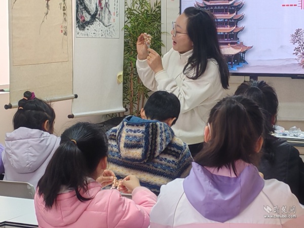 隨后,“閱讀媽媽”將話題自然引向非遺文化:“你們知道嗎?黃鶴樓不僅出現(xiàn)在詩(shī)詞里,還藏在楚繡的針腳中,藏在剪紙的紋樣里……”她通過(guò)展示精美的非遺作品,解讀楚繡中黃鶴紋樣的寓意,講述剪紙藝術(shù)如何再現(xiàn)黃鶴樓的雄姿。在她的娓娓道來(lái)中,黃鶴樓與荊楚非遺的淵源徐徐展開(kāi),孩子們聽(tīng)得入神,眼中閃爍著好奇與向往。