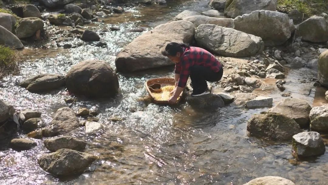 麥市干子的制作從農(nóng)家婦人篩選和浸泡黃豆開始,數(shù)小時后,浸泡好的黃豆被撈起,在溪流中淘洗,其景可以入畫。