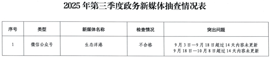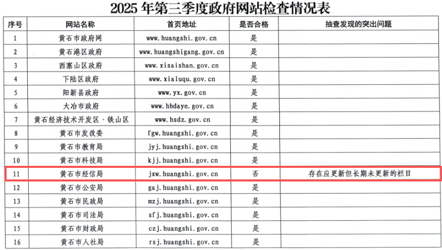 荊楚網(wǎng)(湖北日?qǐng)?bào)網(wǎng))訊(記者 呂鑒蕾)記者24日獲悉,日前,黃石市政務(wù)服務(wù)管理局組織開展了2025年第三季度全市政府網(wǎng)站與政務(wù)新媒體檢查。其中,黃石市經(jīng)信局官網(wǎng)和“生態(tài)洋港”公眾號(hào)因日常維護(hù)管理不到位被點(diǎn)名。