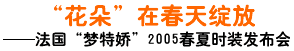 2005年4月5日,源自“時(shí)尚之都”巴黎的經(jīng)典法國時(shí)裝品牌夢特嬌,于春天伊始在武漢香格里拉大飯店上演一場激情四溢的時(shí)尚秀。在夢特嬌春夏時(shí)裝武漢發(fā)布會上,設(shè)計(jì)師們將經(jīng)典、動感和優(yōu)雅融入夢特嬌最新春夏亮絲時(shí)裝系列,將現(xiàn)代經(jīng)典、都市休閑魅力、動感動力、永恒經(jīng)典和瑰麗高雅五大主題一一呈現(xiàn)。而那最負(fù)盛名的“花朵”標(biāo)志,則仿若今春最絢爛綻放的花朵,在展示臺上奏出一支“春天的圓舞曲”。