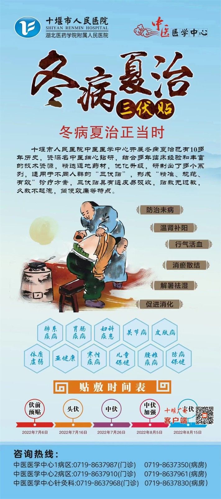 陳峰主任特別提醒:“三伏”穴位貼敷4次為一個療程,一般需連續(xù)貼敷3年至5年。每次貼敷時長2小時為宜,皮膚敏感者及兒童根據(jù)皮膚耐受程度應縮短貼敷時間,有發(fā)熱、皮膚潰破、體質(zhì)特別虛弱及患有糖尿病及瘢痕體質(zhì)人群幾類疾病人群,不適宜貼敷三伏貼,同時貼敷三伏貼,應在醫(yī)師指導下進行貼敷,貼敷過程中,飲食要注意清淡,避免受風受涼。