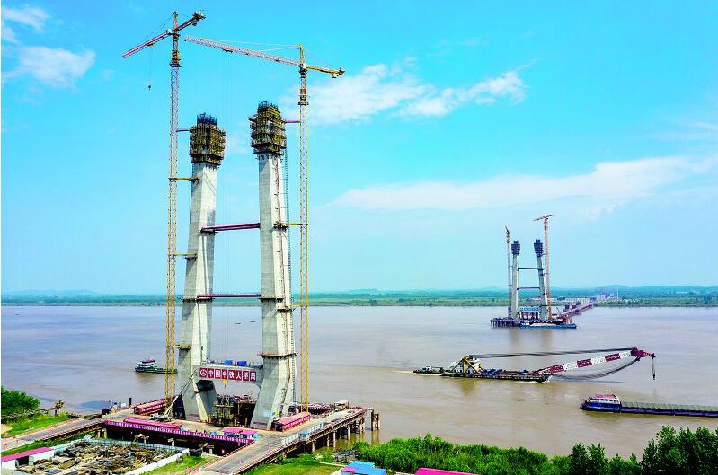 8月21日,赤壁長江大橋正在進行南北主塔中塔柱施工,南北主塔高度達到了133米,占總高度的60%左右。赤壁長江大橋連接赤壁市與洪湖市,主橋是雙塔雙索面斜拉結(jié)構(gòu),主塔為H形。承建單位中鐵大橋局在高溫天氣縮短白天施工時間,早晚補工,保障施工進度不因酷暑延后。預計明年2月能按期實現(xiàn)主塔封頂?shù)仁┕つ繕恕#ㄒ暯缇W(wǎng) 馬海斌 攝)