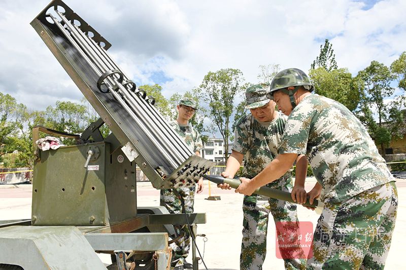 26日,在崇陽縣港口鄉(xiāng)中學(xué),該縣氣象局工作人員正在此架設(shè)火箭炮,守候?qū)α髟茖?,抓住有利時機實施人工增雨抗旱作業(yè)。