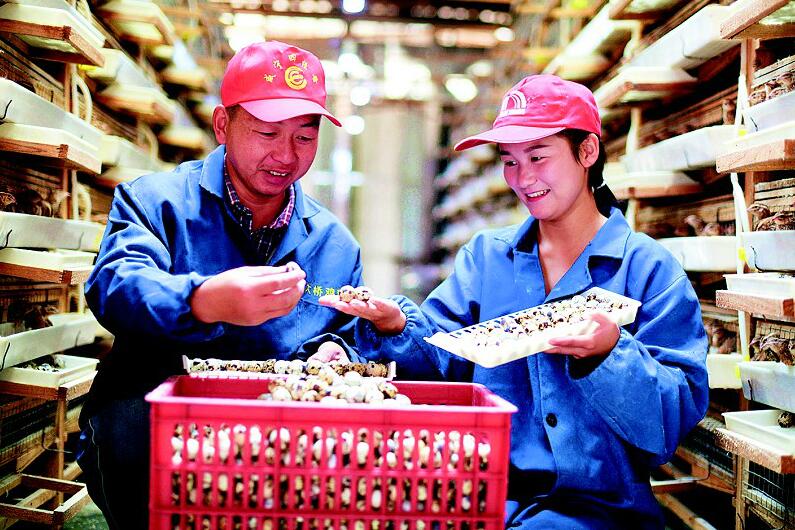 10月29日,在通城縣沙堆鎮(zhèn)石沖村,貧困戶游明夫妻在撿鵪鶉蛋。在鎮(zhèn)村干部的幫扶下,游明自學養(yǎng)殖鵪鶉技術(shù),利用空閑廠房辦起了養(yǎng)殖場,并提供鵪鶉種苗,傳授養(yǎng)殖技術(shù),帶動周邊村6戶貧困戶一起脫貧致富,助力鄉(xiāng)村振興。(視界網(wǎng) 劉建平 攝)