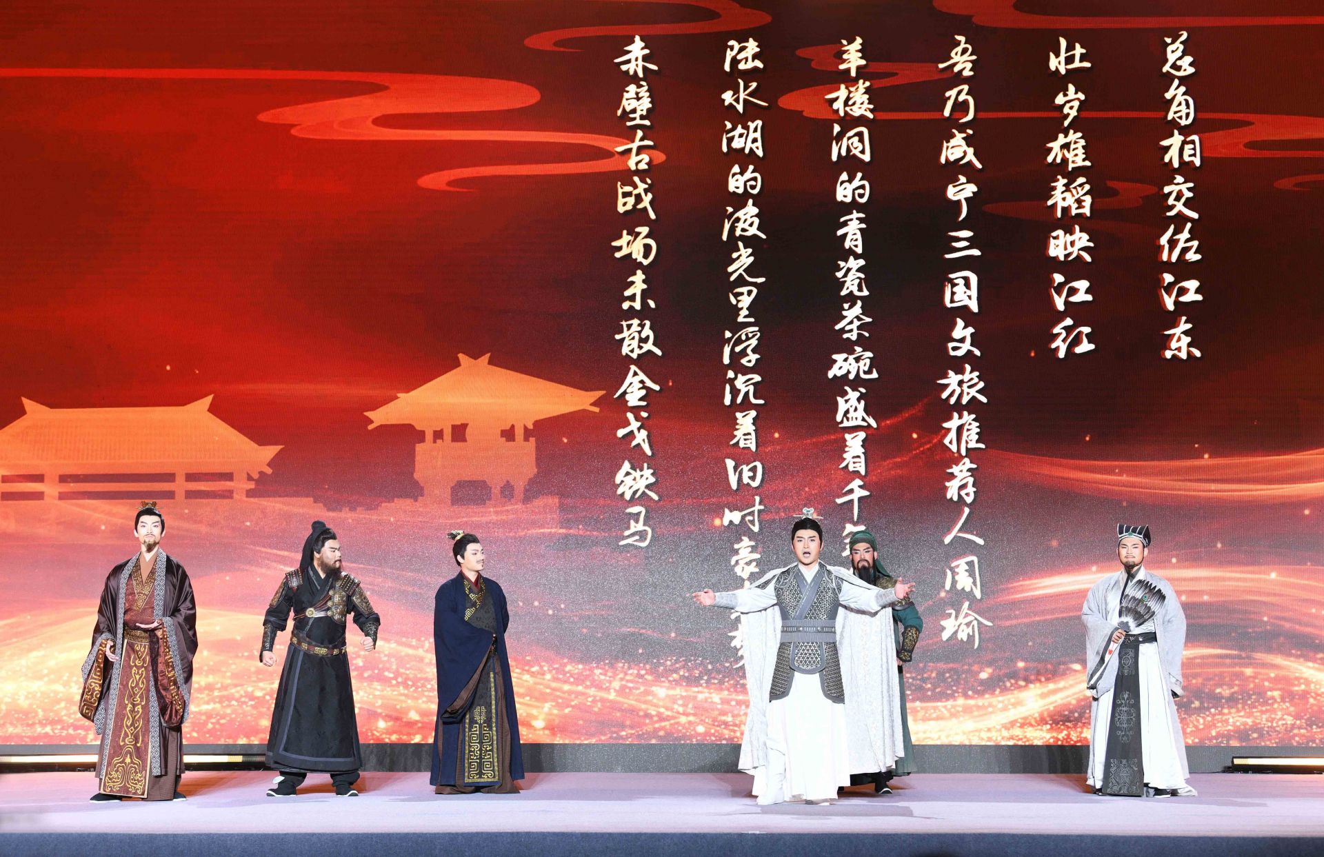 “三國六城,今日結(jié)盟!與君共同開啟,荊楚三國文化之旅?!眴?dòng)式上,身著古裝的文旅推薦官,化身三國英雄劉備、關(guān)羽、張飛、諸葛亮、孫權(quán)、周瑜等,穿越歷史時(shí)空,分別代表武漢、荊州、宜昌、襄陽、鄂州、咸寧對外推介各地三國旅游景點(diǎn)和線路。